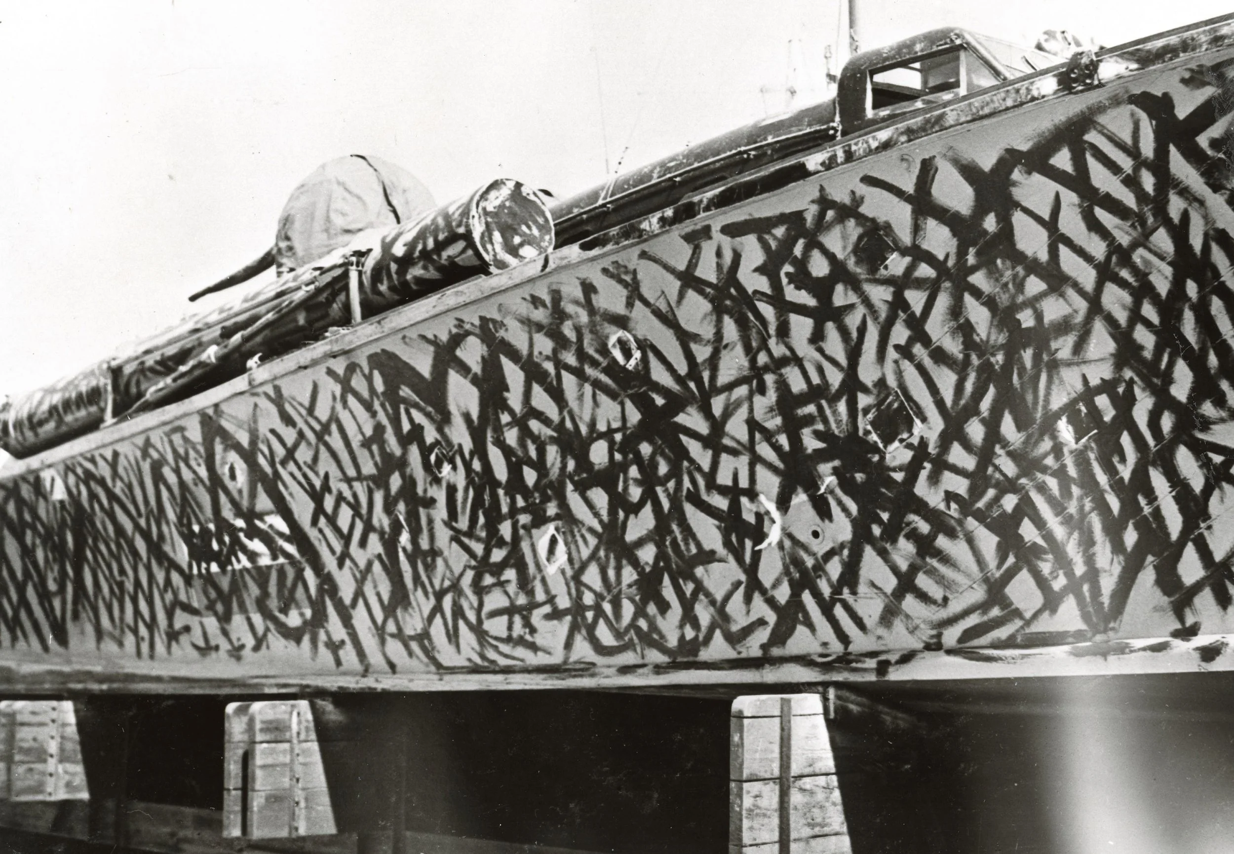 Upon arrival at the shipyard, the wounded and the fallen were taken off the vessel. The yard workers immediately began repair work—no luxury with more than three hundred holes in the hull. The boat was also camouflaged with patches of different colors of paint, in the hope of making it less conspicuous.